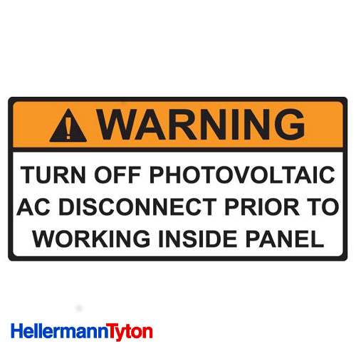 Pre-printed Solar Safety Label 4.12 X 2 Black text on an Orange/White background that reads as: WARNING - TURN OFF PHOTOVOLTAIC AC DISCONNECT PRIOR TO WORKING INSIDE PANEL. 596-00499 (Quantity 1)